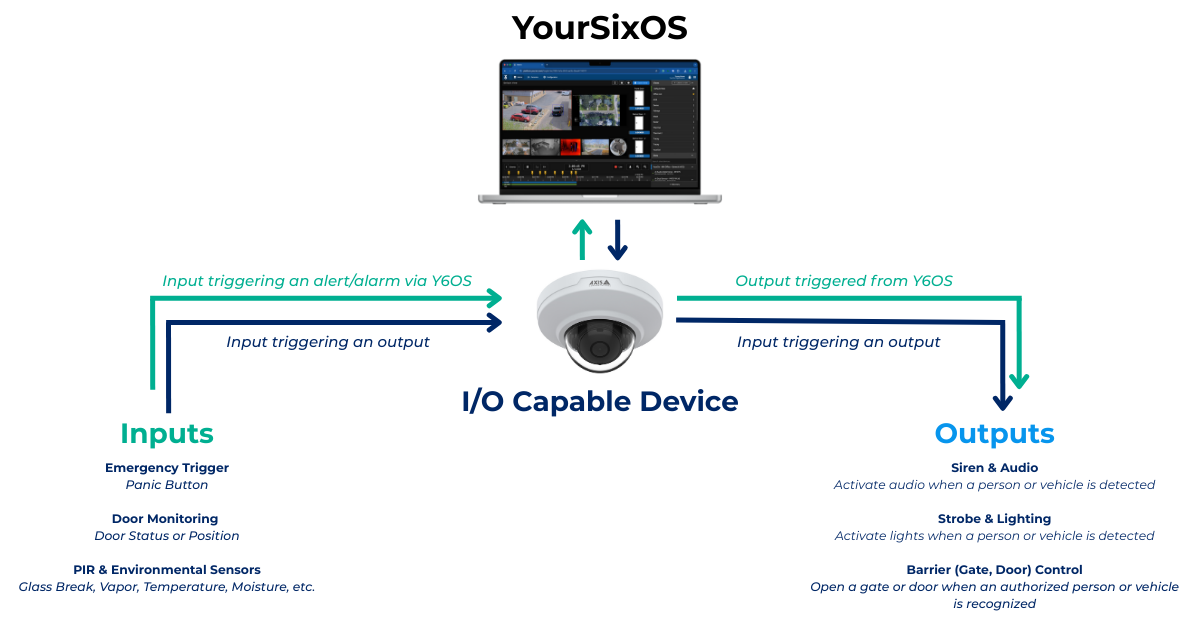 With the Y6OS platform, users can interact with peripheral devices in real time. This allows for actions like opening a gate or activating a siren or light directly through an I/O-enabled device.